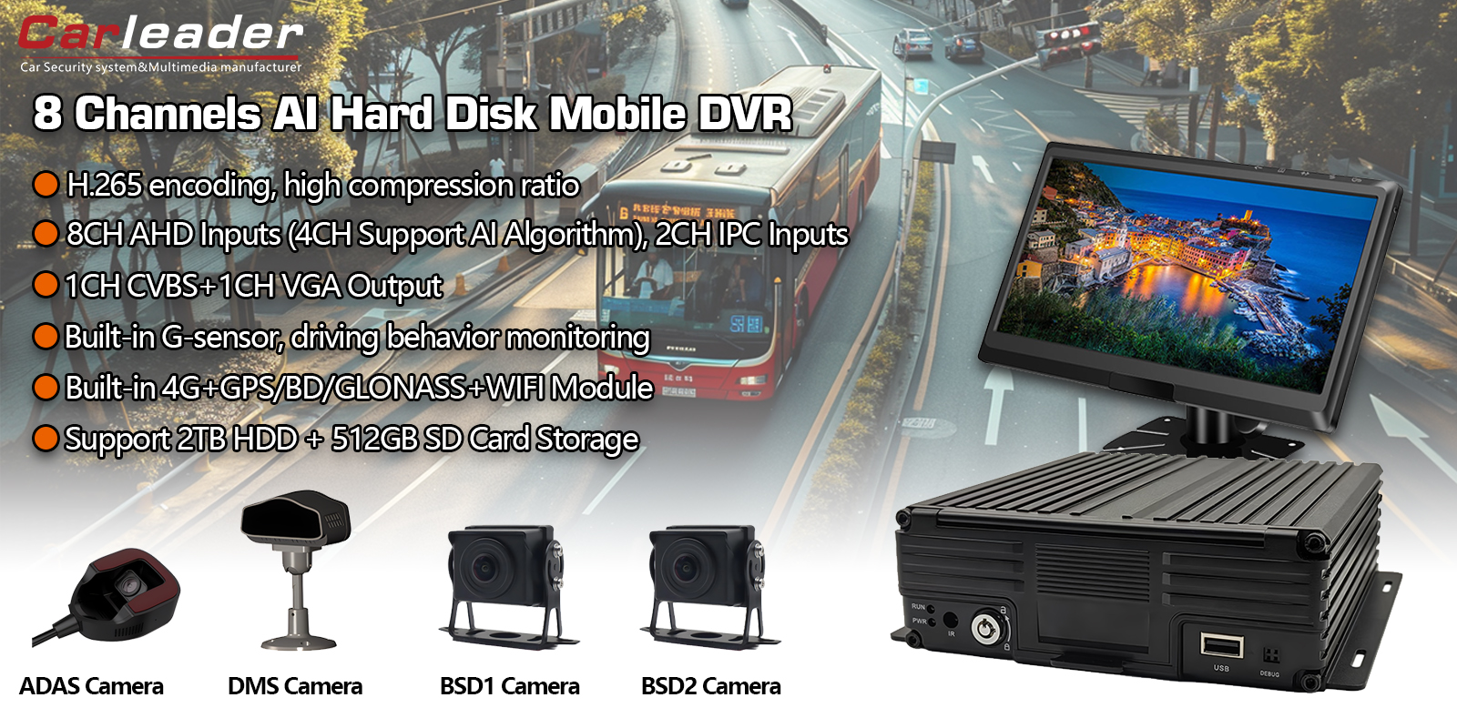 ແນະນຳ Carleader8CH AI HDD Mobile DVR ຮອງຮັບ ADAS+DMS+BSD, ເຄື່ອງບັນທຶກວິດີໂອດິຈິຕອລດິຈິຕອລ Hard Drive ລະດັບສູງ 8 ຊ່ອງທີ່ອອກແບບມາເພື່ອການເຝົ້າລະວັງຍານພາຫະນະແບບມືອາຊີບ ແລະ ການຈັດການເຮືອອັດສະລິຍະ. ປະສົມປະສານການອອກແບບຮາດແວທີ່ເຂັ້ມແຂງກັບລະບົບ AI ຂັ້ນສູງລວມທັງ ADAS, DSM, BSD. ມັນສະຫນອງການບັນທຶກວິດີໂອທີ່ເຊື່ອຖືໄດ້, ຄຸນນະພາບສູງ, ການຊ່ວຍເຫຼືອຜູ້ຂັບຂີ່ທີ່ສົມບູນແບບ, ແລະການຕິດຕາມຄວາມປອດໄພຢ່າງຫ້າວຫັນ - ທັງຫມົດໃນລະບົບດຽວ.