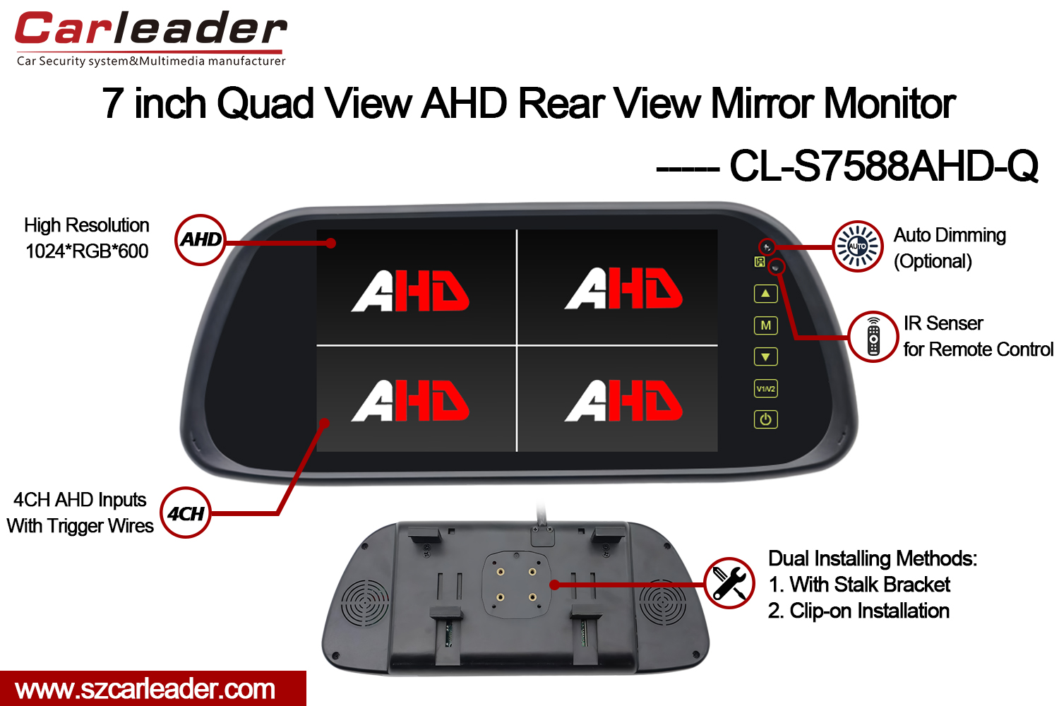 ຍົກລະດັບການຜູ້ນໍາຈໍສະແດງຜົນກະຈົກ 7 ນິ້ວ 4CH Quad AHD ຮອງຮັບການຕິດຕັ້ງຄູ່ສໍາລັບການເບິ່ງເຫັນທີ່ບໍ່ສາມາດປຽບທຽບໄດ້, ຄວາມຫນ້າເຊື່ອຖື, ແລະຄວາມສະຫງົບຂອງຈິດໃຈໃນຖະຫນົນຫົນທາງ.
