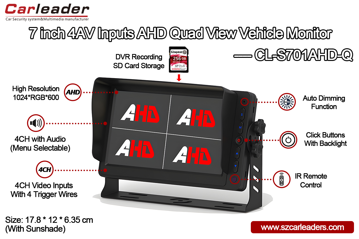 Carleader ມີຄວາມພູມໃຈທີ່ຈະນໍາສະເຫນີໃຫ້ທ່ານຂອງພວກເຮົາ7 ນິ້ວ 4CH AHD Inputs Quad View Display Monitor, ການອອກແບບມຸມເບິ່ງ quad ສາມາດຮອງຮັບ 4 ຊ່ອງສໍາລັບກ້ອງຖ່າຍຮູບຂອງຍານພາຫະນະ, ເຊັ່ນ, Front View, Side View x2, Rear View, ຊ່ວຍໃຫ້ຜູ້ຂັບຂີ່ຍານພາຫະນະຂະຫນາດໃຫຍ່ (ລົດເມ, ລົດບັນທຸກ, ແລະລົດຕູ້ສົ່ງ, ຕິດຕາມກວດກາທັດສະນະຫຼາຍຂອງສິ່ງອ້ອມຂ້າງຂອງເຂົາເຈົ້າໃນຂະນະທີ່ປະຕິບັດການຍານພາຫະນະ.