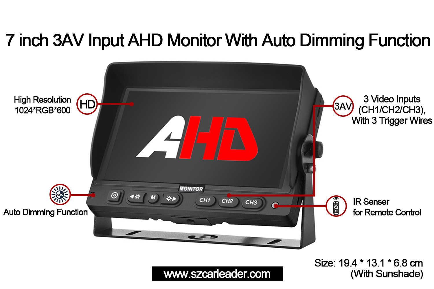 ຜູ້ນໍາ7 ນິ້ວ 3CH AHD Inputs Vehicle Backup Monitorເປັນຈໍພາບ AHD ຂະໜາດ 7 ນິ້ວທີ່ແຂງແຮງທີ່ອອກແບບມາເພື່ອການເຊື່ອມໂຍງກັບລະບົບເຝົ້າລະວັງ ແລະລົດຍົນ. ປະກອບດ້ວຍແຜງດິຈິຕອລ Innolux ທີ່ມີອັດຕາສ່ວນ 16:9, ມັນໃຫ້ພາບທີ່ຄົມຊັດໃນຄວາມລະອຽດ 1024xRGBx600, ຮັບປະກັນຄວາມຊັດເຈນສໍາລັບຄໍາຮ້ອງສະຫມັກທີ່ສໍາຄັນ. ນອກຈາກນີ້ຍັງມາພ້ອມກັບການປ້ອນຂໍ້ມູນວິດີໂອ 3 ຊ່ອງ AHD ເພື່ອໃຫ້ເຫມາະສົມກັບການເບິ່ງເຫັນຍານພາຫະນະສ່ວນໃຫຍ່.