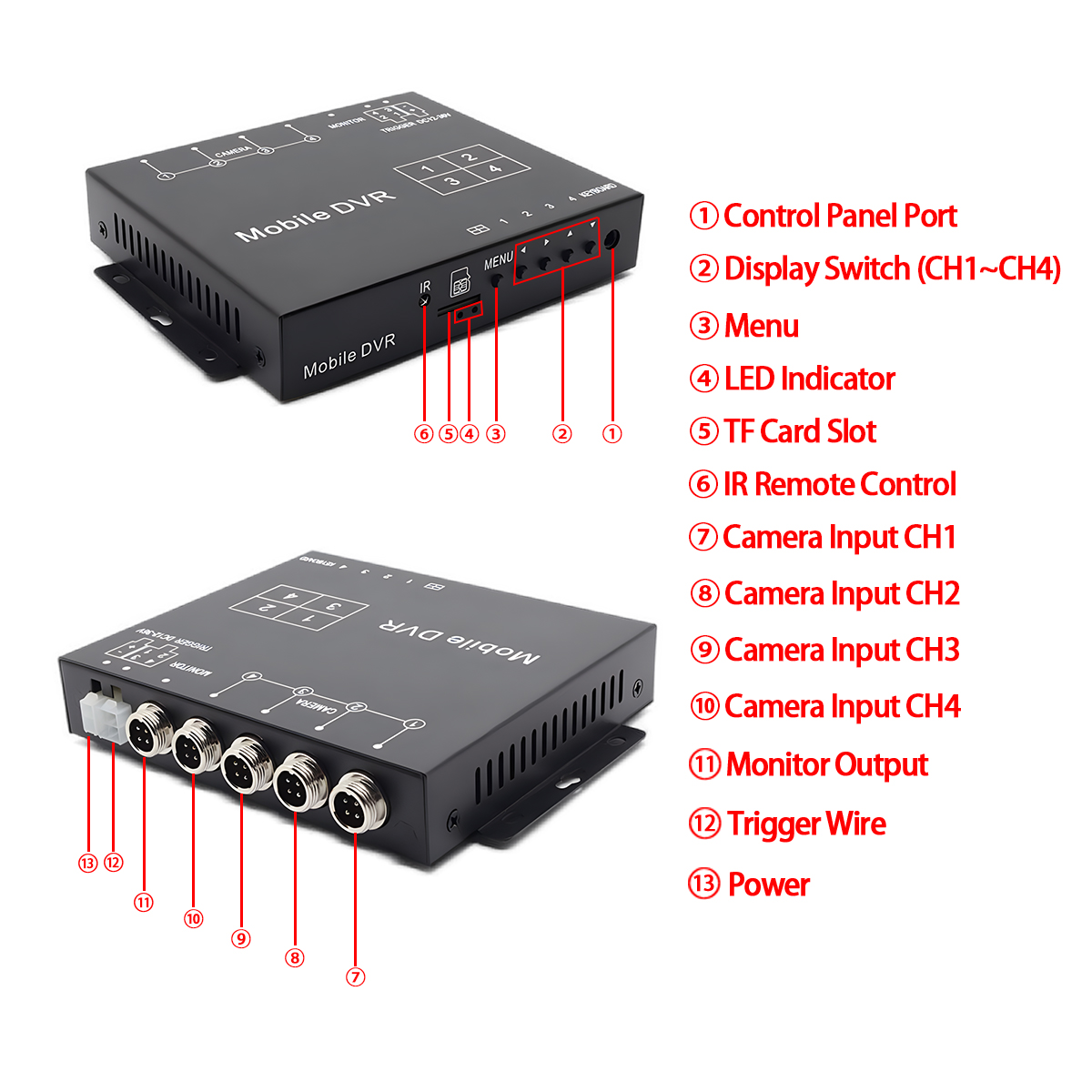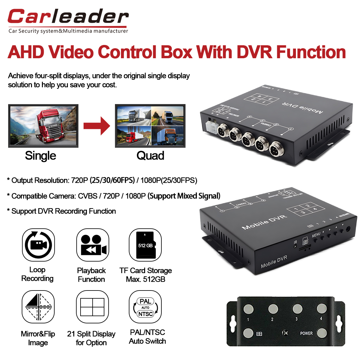 Carleader Quad Video Splitter Box ສົມທົບຄວາມສະດວກສະບາຍຂອງກ່ອງແຍກວິດີໂອ 4CH ກັບຄວາມປອດໄພຂອງຟັງຊັນບັນທຶກ DVR. ຊຸດຄຸນສົມບັດທີ່ສົມບູນແບບຂອງມັນ, ລວມທັງການຕັ້ງຄ່າຮູບພາບແຍກຕ່າງຫາກ, ຮູບແບບການກະຕຸ້ນແບບຍືດຫຍຸ່ນ (ສາຍກະຕຸ້ນ & ການຄວບຄຸມໄລຍະໄກ), ການປັບຂອບຂອງຫນ້າຈໍ, ການປ້ອນຂໍ້ມູນແຮງດັນທີ່ກວ້າງ, ແລະການປົກປ້ອງທີ່ເຂັ້ມແຂງ - ສະຫນອງການແກ້ໄຂການເຝົ້າລະວັງທີ່ເຊື່ອຖືໄດ້ແລະມີຄຸນນະພາບສູງທີ່ເຫມາະສົມກັບສະພາບແວດລ້ອມມືຖືທີ່ຕ້ອງການ. ຮັບປະກັນການຮັບຮູ້ສະຖານະການຄົບຖ້ວນແລະຫຼັກຖານວິດີໂອທີ່ປອດໄພດ້ວຍ Carleader 1080P AHD Quad Split Display Video Processor ຮອງຮັບການບັນທຶກວິດີໂອ.
